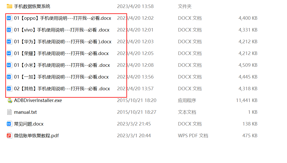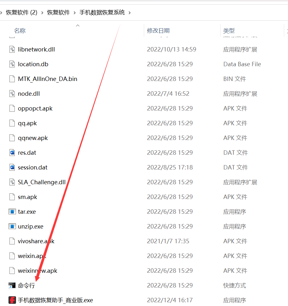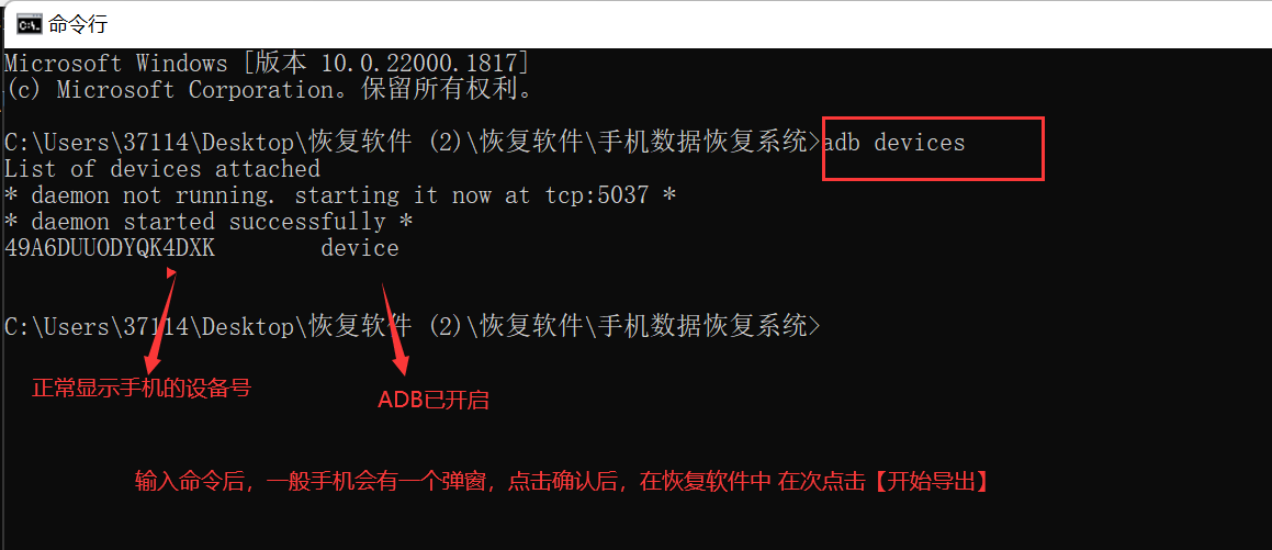 如果以上问题都无误,可以打开 【手机数据恢复系统】文件夹 找到命令行 输入 ADB devices 回车,一般手机会有弹窗,